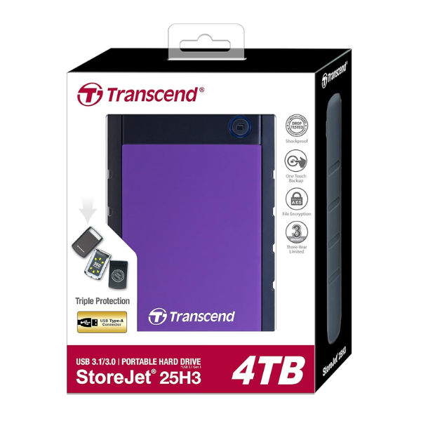 Built with a durable anti-shock rubber case, the iron grey Transcend USB 3.0 External Hard Drive from Transcend combines a 4TB(4000GB) storage capacity with a USB 3.0 interface, 256-bit AES file encryption, and military-grade shock resistance. The internal 2.5″ hard drive receives further protection from a suspension system, while a one-touch auto-backup button helps to create a second copy of your data and a quick reconnect button re-enables the removed hard drive without needing to remove and reinsert the USB cable. Power is provided via the USB bus, and compatible operating systems include Windows, Mac, and Linux.